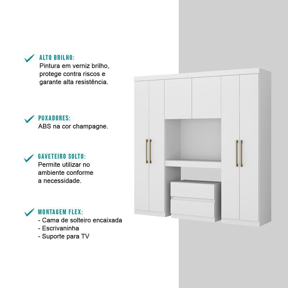 O Roupeiro Porto possui 6 portas de batente e gaveteiro móvel. É um produto chave para diferentes necessidades, já que sua peça central pode ser montada de diversas formas, como: painel de TV, mesa de escrivaninha ou cabeceira de cama de solteiro. Além disso, o gaveteiro solto permite a utilização da peça em vários cantos do ambiente.